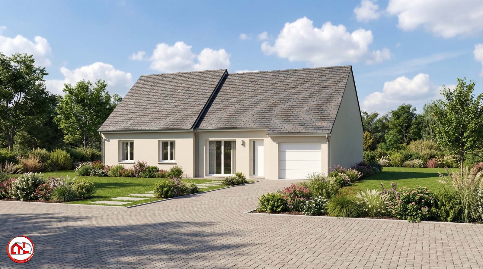 Maison traditionnelle de plain-pied d’environ 100 m² habitables avec 3 chambres, une belle pièce de vie ouverte, un cellier pratique et un garage intégré. Un modèle fonctionnel, convivial et parfaitement adapté à la vie de famille.